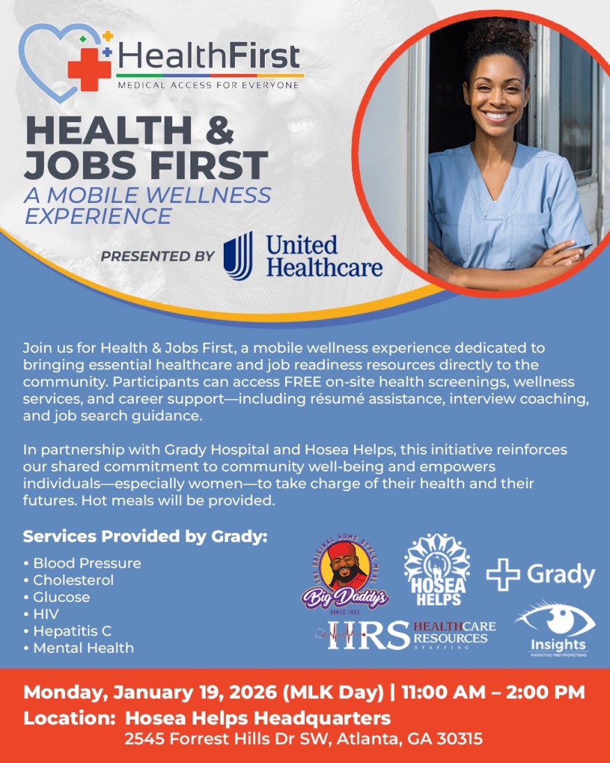 ATLANTA, GA — January 8, 2026 — In honor of Dr. Martin Luther King Jr. Day, United Healthcare, in partnership with Hosea Helps & Grady proudly announces Health & Jobs First—a mobile wellness and career empowerment event dedicated to strengthening the health and economic stability of Atlanta residents.Taking place onMonday, January 19, 2026, from 11:00 AM to 2:00 PMat Hosea Helps Headquarters (2545 Forrest Hills Dr. SW, Atlanta, GA 30315), this community-centered activation is expected to serve 500+ attendees with vital resources that support both immediate well-being and long-term economic growth. Health & Jobs First is designed to meet people exactly where they are—providing essential services at no cost to individuals and families who need them most.
