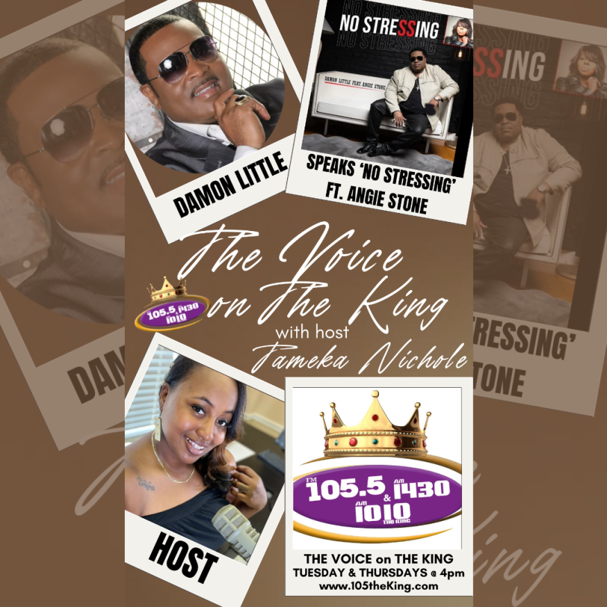 Today at 2pm a special episode of The Voice on The King with host @tamekanichole, with special guest @iamdamonlittle, Grammy Award-winning songwriter, inspirational independent recording artist, record executive, activist, and humanitarian as we chat about Damon Little chart-topping single with @theangiestone, “NO STRESSING”!
