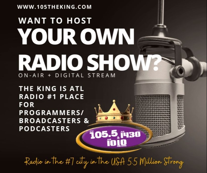 You’ve thought about it for a very long time!!! The time is right, and the time is now! You can now Host your own live radio show ON THE AIR in ATLANTA on Atlanta's #1 Station - AM 1010 - AM 1430 - 105.5 FM The King!!! Sports, News, Inspiration, Ministry, Lifestyle, Music, Health, Relationships, Independent Artists, Spoken Word, Community, Fashion, Promotions – You Dream it, and Make it Reality!!!